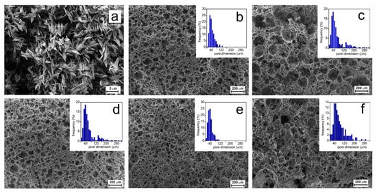 SEM micrographs of the scaffolds prepared by varying polymer mixture composition and [Ch][Tau] concentration in water: (a) sample composed of PLLA only; (b) PLA-50-1; (c) PLA-65-0.32; (d) PLA-65-1; (e) PLA-65-5; (f) PLA-80-1. In the insets, the histograms of pore diameter distributions are reported.