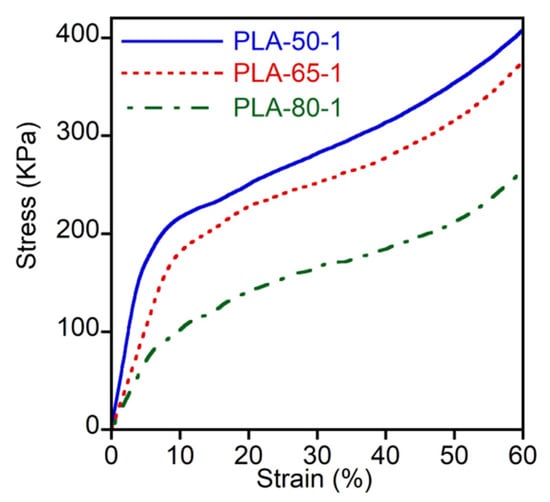 Stress–strain curves of PLA-50-1, PLA-65-1, and PLA-80-1 scaffolds recorded during compression at a strain rate of 5 mm min−1.