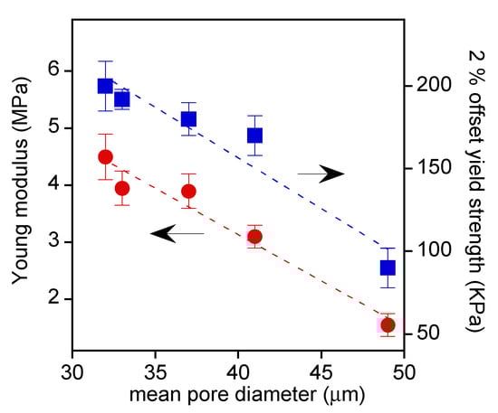 At low strain, the stress increased linearly up to the nonreversible sample deformation in correspondence to the curve bending. The Young’s modulus, evaluated from the slope of the initial linear region, and the 2% offset yield strength are reported in Figure 8 as a function of the mean pore dimension, which is the feature that mainly influenced the scaffolds’ mechanical properties.