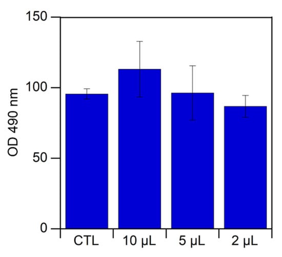 To establish if [Ch][Tau] was devoid of any toxicity, human primary a (HPCs) were cultured in the presence of different amounts of ionic liquid (2 μL, 5 μL, and 10 μL). The results of an MTS assay, which was carried out after 48 h of incubation, are reported in Figure 9.