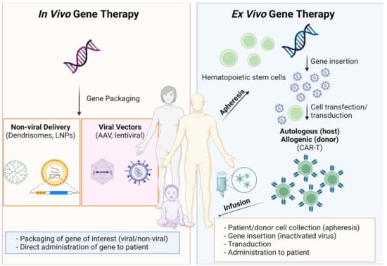 Ex vivo strategies for genetic alteration include cell therapies with a rapidly growing global market predicted to reach 45.4 billion dollars by 2028 [4]. Cell therapies may be broadly referred to as autologous cell therapies in which direct isolation of cells from patients, their culture, expansion and genetic modification takes place outside the body. This is followed by infusion of the genetically altered autologous cells to elicit a therapeutic response. Allogenic cell therapies exemplified by mesenchymal stem cells or pluripotent stem cells can be manufactured at a commercial scale and are available as off the shelf products [5].