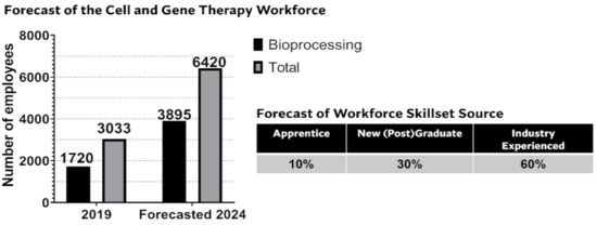 Findings from the CGT Catapult survey of the UK ATMP workforce, including the workforce statistics with a forecasted 112% increase in the total workforce and 126% increase in bioprocessing roles within the cell and gene therapy industry (left). Forecast of the proportion of contribution from various skillset sources to the cell and gene therapy industry (right), adapted from [26].