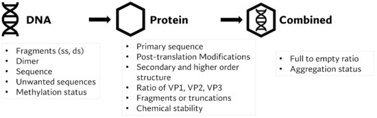 Product Critical Quality Attributes for viral in vivo gene delivery systems at DNA, protein and combined levels. ss: single strand, ds: double strand, vp: viral particles.