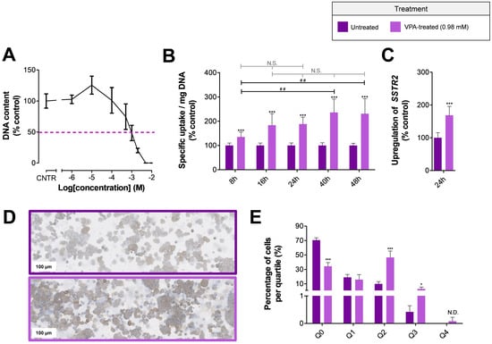 RT-qPCR and immunohistochemical analyses were performed to study SSTR2 mRNA and SSTR2 protein-expression levels after treating NCI-H69 cells for 24 h with VPA. SSTR2 mRNA expression levels were significantly upregulated 1.69-fold compared to untreated cells (Figure 1C). In line with this, immunohistochemical analysis showed a clear increase in SSTR2 protein-expression levels (Figure 1D). Quantification of the total SSTR2 staining demonstrated a reduction in the number of SSTR2 negative cells (Q0), i.e., 70.6 ± 3.3% versus 34.4 ± 5.0% for untreated and VPA-treated cells, respectively. Furthermore, a significant increase in the percentage of cells in quartile two (Q2) and three (Q3) was observed after VPA treatment, suggesting an increase in the number of SSTR2-positive cells characterized by higher SSTR2 expression levels (Figure 1E).