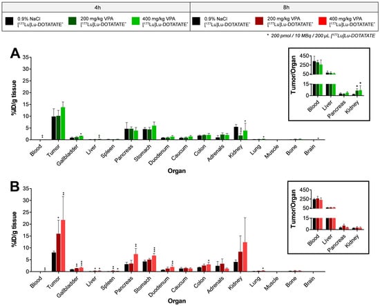 Contrary to the tumor uptake of animals pretreated with VPA four hours before [177Lu]Lu-DOTATATE administration, the biodistribution data of mice injected with VPA eight hours before radiotracer injection demonstrated significantly increased [177Lu]Lu-DOTATATE tumoral uptake. The tumor uptake was 15.9 ± 5.7% ID/g for 200 mg/kg and 21.7 ± 9.9% ID/g for 400 mg/kg VPA-treated mice compared to 8.0 ± 0.6% ID/g for untreated animals (Figure 2B). However, the physiological uptake of [177Lu]Lu-DOTATATE was also significantly increased. Whereas the lower dose of 200 mg/kg VPA only resulted in a statistically significant increased uptake in the gallbladder, liver and spleen, treatment with 400 mg/kg VPA also significantly increased the radiotracer uptake in pancreas, stomach, duodenum, colon and lungs. As a result of the increased physiological [177Lu]Lu-DOTATATE uptake and the increased amount of radiotracer in the tumor, no differences in tumor-to-organ ratios were observed (Figure 2B and Supplementary Materials Figure S1B).