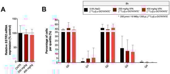 In vivo tumoral SSTR2 expression levels after VPA-treatment Tumors of NCI-H69 tumor-bearing mice injected with vehicle or VPA (200 mg/kg or 400 mg/kg) eight hours prior to [177Lu]Lu-DOTATATE administration were analyzed for SSTR2 mRNA expression levels (A) and SSTR2 protein-expression levels (B). The percentage of SSTR2 negative cells (Q0) and the extent of SSTR2 intensity (Q1–Q4) were determined (B).