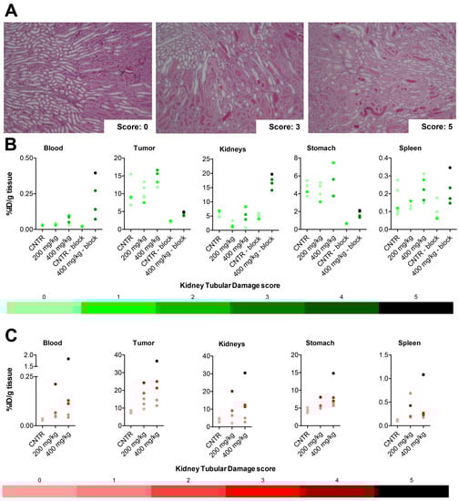 The kidneys of mice injected with the radiotracer eight hours post-VPA-administration, where a significant increased amount of [177Lu]Lu-DOTATATE tumor uptake was observed, were also examined for kidney toxicity. All untreated animals received a damage score of 0, and the damage score for VPA-treated mice varied from 0 to 5. On average, the damage score was 1.6 for treatment with 200 mg/kg and 2.6 for 400 mg/kg VPA. A detailed overview of all damage scores can be found in Table 1. When correlating the renal tubular damage score and [177Lu]Lu-DOTATATE uptake of several organs, it was demonstrated that high [177Lu]Lu-DOTATATE uptake was often associated with high levels of renal tubular damage (Figure 4C and Supplementary Materials Figure S4).