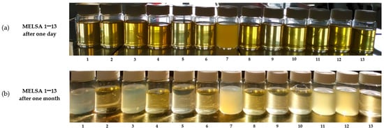 Photo capture of MELSA 1–MELSA 13 microemulsions at one day after preparation—case (a), and after one month—case (b), visualized at room temperature, 25 ± 0.5 °C.