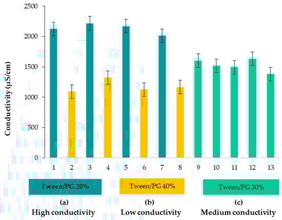 Graphical representation of conductivity values for microemulsions, dividing them as systems with (a) High conductivity, (b) Low conductivity, and (c) Medium conductivity, depending on Tween 80/PG concentration.