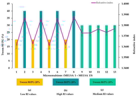 Graphical representation of refractive index variation for microemulsions, considering three cases: (a) systems with low RI values, (b) systems with high RI values, and (c) systems with medium RI values, depending on Tween 80/PG concentration.