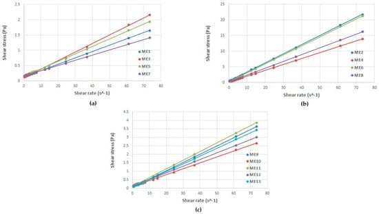 A rheological evaluation was performed for each microemulsion, with respect to phase behavior and flow characteristics as a function of internal composition based on the formulation factors involved. MELSA 1–MELSA 13 microemulsions were analyzed at 25 ± 0.5 °C, using Multi Visc Rheometer (Fungilab, Barcelona, Spain), equipped with an LCP spindle, as previously reported [57,85]. Viscosity measurements were performed by applying a rotation speed between 0.3–60 rpm, corresponding to a shear rate between 0.36 and 73.38 s−1.