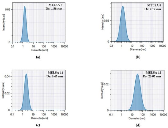 On the first day after preparation, all microemulsions with the exception of MELSA 7 had a clear appearance. Their color and odor were associated with the presence of Tween 80, lecithin, and the oil phase, resulting in systems with a yellowish aspect, with a variation in intensity depending on the concentration of the components. In the case of MELSA 7, the minimum concentration of 20.3% Tween 80/PG/lecithin and 2% oat oil determined the formation of an opalescent system. In Figure 2—case (a), a photo capture of microemulsions after one day from preparation at 25 ± 0.5 °C is presented. In the first month, four more microemulsions tended to vary in opalescence, namely: MELSA 1, MELSA 3, MELSA 11, and MELSA 12, which can be observed in a photo capture of microemulsions after 1 month, presented in Figure 2—case (b) at 25 ± 0.5 °C. The opalescence was persistent due to a medium concentration of oil at 1.5%, dispersed with minimum concentrations of Tween 80/PG/lecithin at 20.1% (in the case of MELSA 1), or 20.5% (in the case of MELSA 3). On the other hand, the use of a maximum oil level of 2% affected the clarity of MELSA 11 and MELSA 12 even if Tween 80/PG/lecithin were set at medium levels of 30.1% or 30.5%.