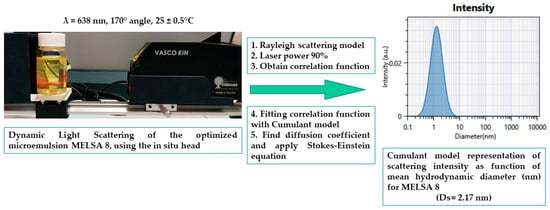 Droplet size distribution and polydispersity index (PDI) were studied at 25 ± 0.5 °C, applying a dynamic light scattering (DLS) technique on undiluted samples. Accurate measurements were performed using a VascoKin particle analyzer (Cordouan Technologies, Pessac, France), equipped with a 638-nanometer laser. In addition, the study of particle behavior was undertaken using an in-situ head which assured a back-scattering mode, by applying a scattering angle of 170°. Size distribution (nm) as a function of intensity (a.u.) was obtained for each microemulsion sample, according to the Cumulant algorithm, being associated with the autocorrelation function expressed as time (μs) as a function of intensity (a.u.). The results were fitted using the Rayleigh model [86,87].