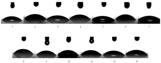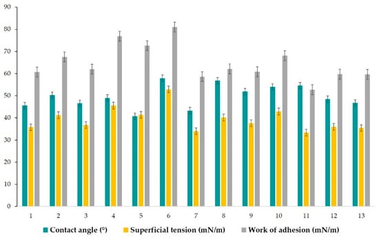 where, represents the work of adhesion, —the superficial tension to L/G interface, and —the contact angle determined previously, by applying the contact angle model. All determinations were performed in triplicate at 25 ± 0.5 °C.