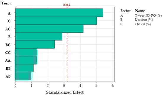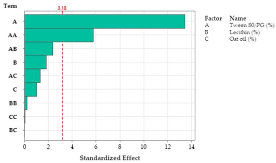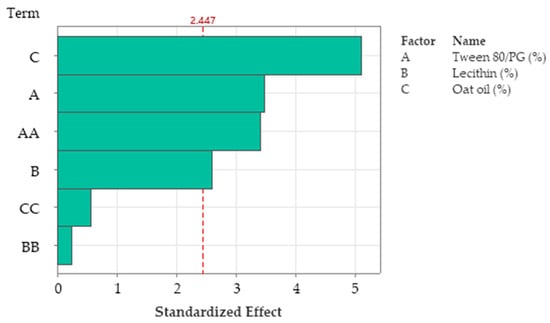 The equations were interpreted using ANOVA analysis. As a part of the surface response methodology, Pareto charts were suggested as valuable representations to determine which of the independent factors were significantly determinative of the evaluated parameters. The predicted response values for optimal formulations were assessed and compared with the experimental results based on factorial plotting of the main effects of variables and the response optimization approach [92].