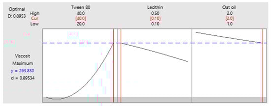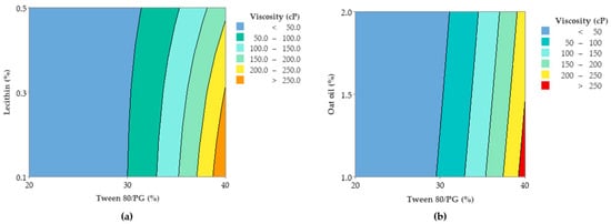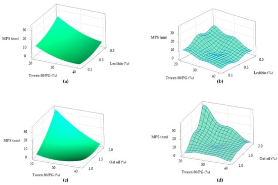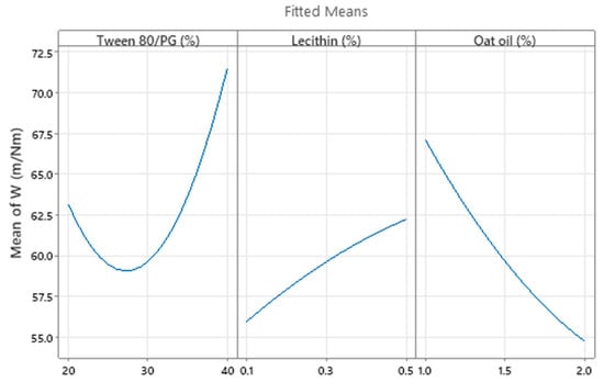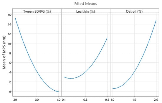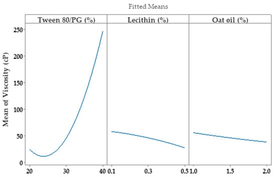 To optimize the formulation parameters and find an optimal microemulsion with proper physical and quality characteristics, three independent variables were selected, namely: Tween 80/PG concentration (X1), lecithin concentration (X2), and oat oil concentration (X3), at three levels of variation, coded as follows: low (−1), medium (0) and high (+1). A 33 fractional factorial design was generated using Minitab software (Minitab-Trial version, LLC, State College, PA, USA). Overall, 13 formulations equivalent to 13 runs with one center point without replication were generated, developed, and evaluated, choosing several responses as dependent variables, coded as Y: viscosity (Y1), mean droplet size (Y2), and work of adhesion (Y3).
