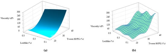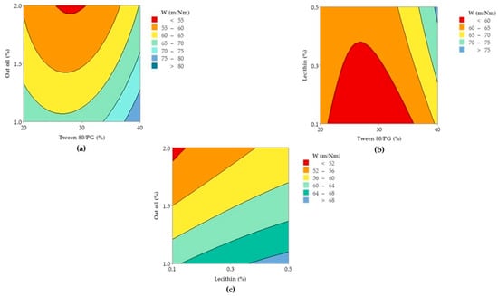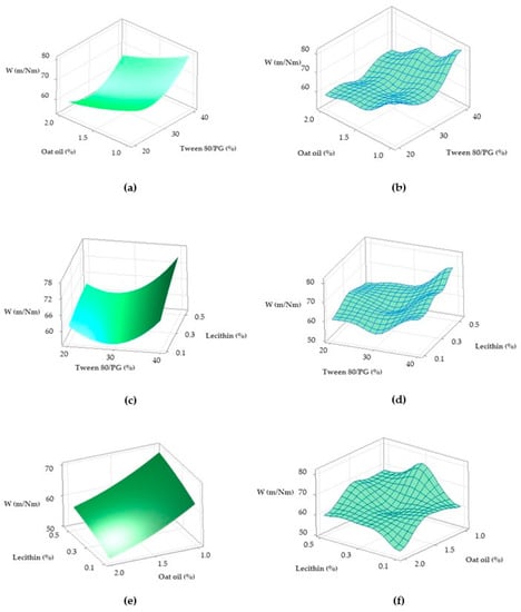 In our case, the Quality by design approach was applied to optimize the physical quality attributes of microemulsions. A three-factor, three-level fractional factorial design was chosen by creating a Box–Behnken model to study the response of three formulation factors and applying RSM. Thus, the effect of the independent variables, namely X1—Tween 80/propylene glycol (%); X2—lecithin (%); and X3—oil phase (%) was explored considering their impact upon internal structures and the following dependent variables—Y1: viscosity (cP), Y2: mean droplet size (nm), and Y3: work of adhesion (mN/m).