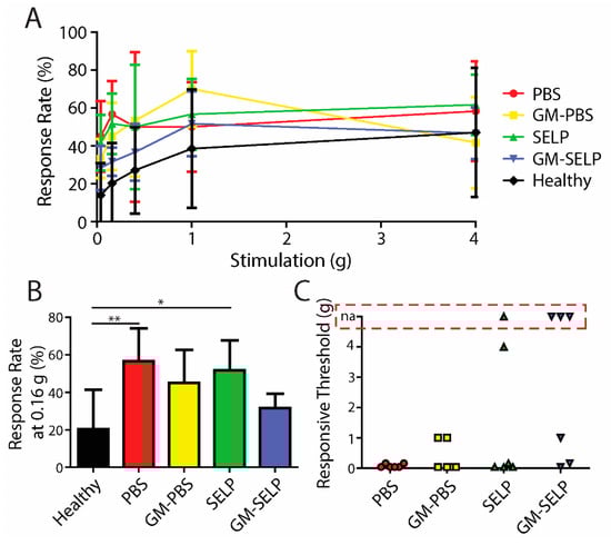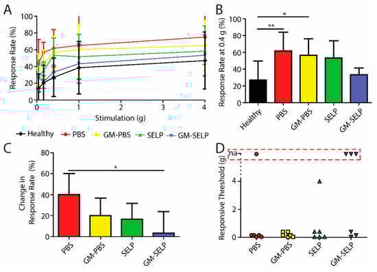 Upon a >20% loss in body weight, mice in the survival group were tested for behavioral pain responses prior to sacrifice. At the time of sacrifice, response rates vary in the exact time following irradiation due to the nature of animal survival and defining a humane endpoint. Increases in response rates, for all irradiated animals, were observed compared to the healthy control group (Figure 4A). At a filament stiffness of 0.16 g, animals receiving GM–SELP (31.7 ± 7.5%) had the smallest increase in response rates compared to all other irradiated groups (Figure 4B). Animals receiving PBS (56.7 ± 17.5%) and SELP (51.7 ± 16.1%) had significantly higher response rates, at 0.16-g stimulus, than healthy animals (20.41 ± 21.03%) at the time of sacrifice (Figure 4B). Allodynia was also evaluated as described above (30% increase from baseline responses). Of these animals, 1/6 and 3/6 mice receiving SELP or GM–SELP did not exhibit allodynic responses, respectively. The remaining 20/24 animals exhibited allodynia as assessed with von Frey filaments. The stimulus threshold required to exhibit a 30% increase in response rate was much smaller in animals receiving PBS (0.08 ± 0.06 g, n = 6) compared to those animals receiving GM–PBS (0.36 ± 0.50 g, n = 6), SELP (0.86 ± 1.75 g, n = 5) or GM–SELP (0.40 ± 0.52 g, n = 3). This behavioral pain assessment at the time of sacrifice further illustrates the implications of the early stages of RIP in this murine model. The modulation of inflammation, pain pathways, or both before or at RIP onset has a sustained effect in this model as illustrated by reduced behavioral pain responses.