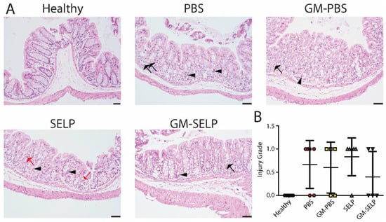 Histologic evaluation at the survival endpoint showed increased luminal migration of epithelial nuclei and variable inflammation in all irradiated groups. Additional alterations included cell flattening in the surface epithelium (n = 11), inflammatory infiltrates within the epithelium (n = 5), loss of goblet cells (n = 11), cryptitis (n = 6), loss of glands (n = 12), and edema (n = 9). Histologic alterations appeared more prominent at the survival endpoint as compared to the findings seen in samples evaluated three days after irradiation (Supplementary Figures S1 and S2) as illustrated by loss of crypts (crypt drop out) and epithelial erosion(s) (Figure 5A). The injury score of GM–SELP (1.5 ± 1.7) was reduced compared to all other irradiated animal groups (PBS: 2.0 ± 1.7, GM–PBS: 2.2 ± 1.8, SELP: 2.2 ± 1.3) when scored in a blinded manner (Figure 5B).