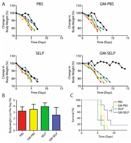 To understand the protective benefits of SELP-mediated delivery at later time points, an additional cohort of animals was evaluated for long term survival following treatment and subsequent exposure to high doses of irradiation to the pelvic region. Animals were followed throughout the study for signs of radiotoxicities and declining health. The primary endpoint was >20% loss in body weight and animals were sacrificed if they crossed this threshold. The >20% weight loss was observed in nearly all irradiated animals, except for a single animal receiving the protective GM–SELP combination (Figure 3A). Over the study period, the GM–SELP combination resulted in the least amount of weight loss per day, compared to the other irradiated groups (PBS, GM–PBS, SELP) (Figure 3B), indicating a protective effect against radiotoxicities. Decreased weight loss per day resulted in an increased GM–SELP animal survival time. The median survival times of animals receiving PBS (6 days), GM–PBS (6.5 days), and SELP (5 days) were less than animals treated with GM–SELP, which survived 8 days (Figure 3C). GM–SELP improved mean survival time by 60%. A fraction of these animals (1/6) exhibited signs of long-term survival, maintaining body weight past the 14-day study period. The use of GM–SELP as a prophylactic resulted in significantly increased survival times when compared to SELP (p < 0.01) alone or the PBS (p < 0.05) sham treatment group (Figure 3C), suggesting a protective effect against early onset of RIP may be imperative for improved quality of life and delayed morbidity.