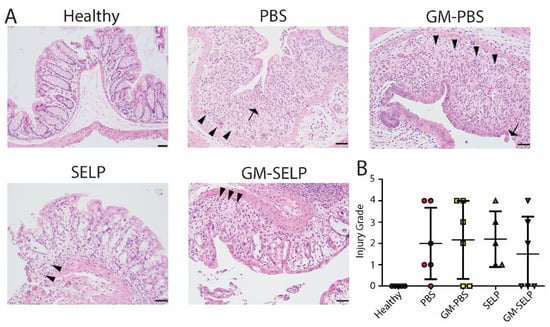 Mice were treated as previously described [17]. Prior to procedures, mice were weighed and fasted overnight by removing all food and bedding from cages. The next morning mice were assigned randomly to experimental groups (n = 6). These included PBS, GM-0111 (100 mg/mL) in PBS (GM–PBS), SELP-415K 11 wt. %, and GM-0111 (100 mg/mL) in SELP-415K 11 wt. % (GM–SELP). Mice were anesthetized with 2% isoflurane. A catheter was inserted into rectums and up to 100 µL of each formulation was slowly instilled into the rectum of each mouse as the catheter was slowly retrieved from the cavity. Mice were then immobilized on an irradiation platform in a supine position. A lead plate was placed above the mice with 4 × 1 cm apertures to restrict irradiation to the lower abdominal region over the rectum. The anus of each mouse was aligned to the bottom of the aperture or immediately below it. Mice then received 37 Gy of irradiation using a RS 2000 X-ray irradiator (RAD SOURCE Technologies, Buford, GA, USA). Immediately following, mice were monitored for a recovery period before being placed back into cages with food and bedding. Mice were then monitored for signs of distress and loss of body weight. Mice were sacrificed at a 3-day timepoint or after loss of >20% of body weight. Animals not exhibiting excess body weight loss were sacrificed at a 14-day endpoint.