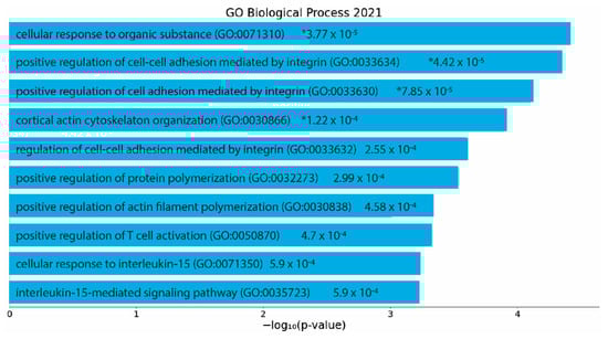 To determine significantly enriched biological processes (p < 0.05), significant differentially expressed genes were then analyzed using EnrichR. Analysis of the protective action of the GM–SELP prophylactic revealed 185 significant biological processes (Supplementary Table S4). The top 10 gene ontology terms included regulation of cell adhesion, cytoskeletal reorganization, actin filament polymerization, and several immune cell signaling pathways (Figure 6). Of these enriched pathways, upstream regulators, and biological processes, a notable number were related to immune responses, emphasizing the immunomodulation capacity of GM-0111.