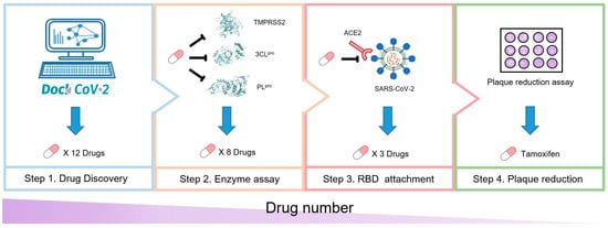 According to their significance in the SARS-CoV-2 life cycle, we selected TMPRSS2, 3CLpro, PLpro, and RBD as target proteins for drug discovery. First, we utilized DockCoV2 as a molecular docking data resource and further analyzed the binding affinity and residue-scale binding pattern. We initially screened 12 drugs that have the potential to inhibit TMPRSS2, 3CLpro, or PLpro. Next, we tested the inhibitory effect of these 12 compounds on the enzyme activity of TMPRSS2, 3CLpro, and PLpro. We obtained 8 compounds with a half-maximal inhibitory concentration (IC50) of <50 μM for TMPRSS2, 3CLpro, or PLpro. Subsequently, we tested the ability of these 8 compounds to inhibit the binding between the spike protein and ACE2, obtaining 3 compounds with a half-maximal effective concentration (EC50) of <25 μM. Finally, we tested these 3 compounds using a plaque reduction assay, revealing that tamoxifen exerts a significant inhibitory effect on the infection and replication of SARS-CoV-2. The overall process is presented in Figure 1.