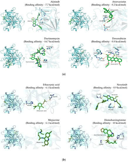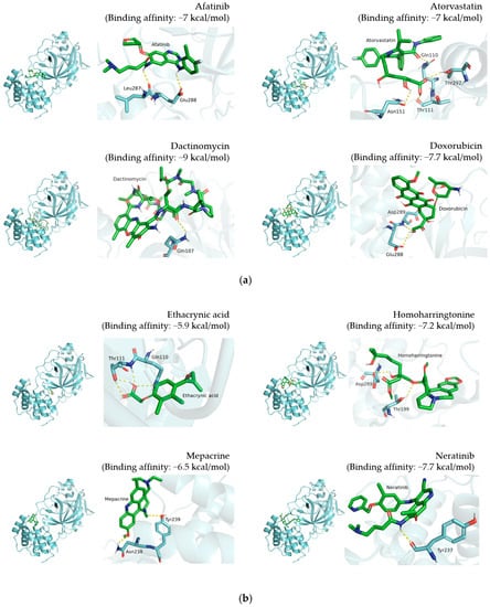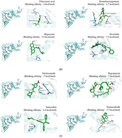 According to the results of inhibition assay, eight compounds (i.e., afatinib, doxorubicin, mepacrine, neratinib, tamoxifen, dactinomycin, rapamycin, and niclosamide) can inhibit TMPRSS2, 3CLpro, or PLpro. Among them, mepacrine is an anthelmintic drug for malaria [39], rapamycin is an immunosuppressant [40], and the remaining compounds are chemotherapeutic agents [41]. In a report published by the American Health System Pharmacists Association, rapamycin and niclosamide are mentioned as drugs against COVID-19 (https://www.ashp.org/-/media/assets/pharmacy-practice/resource-centers/Coronavirus/docs/ASHP-COVID-19-Evidence-Table.ashx, accessed on 15 October 2021).