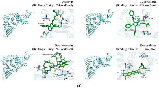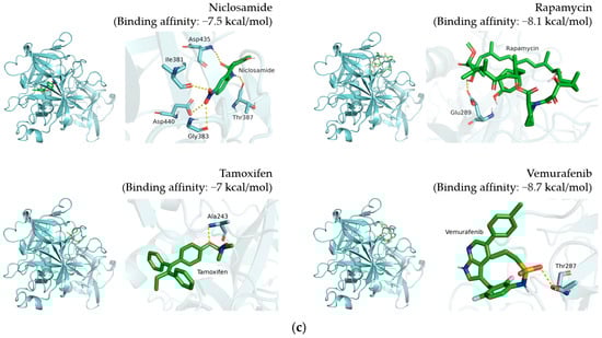 For PLpro, the predicted binding affinities of doxorubicin, niclosamide, rapamycin, and tamoxifen were −8.1, −7, −7, and −6.4 kcal/mol, respectively (Figure 3 and Table 2). Doxorubicin interacts with Glu214, Lys217, Thr259, Lys306, and Ser309 of PLpro through hydrogen bonding (Figure 3a). Niclosamide binds to Glu214 and Lys217 of PLpro (Figure 3c). Rapamycin and tamoxifen interact with Thr75 and Phe258 of PLpro, respectively (Figure 3c).