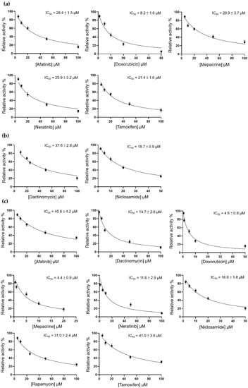 For TMPRSS2, the IC50 values of afatinib, doxorubicin, mepacrine, neratinib, and tamoxifen were 28.4 ± 1.5, 8.2 ± 1.6, 29.9 ± 3.7, 25.9 ± 3.2, and 21.4 ± 1.6 μM, respectively (Figure 5a). For 3CLpro, dactinomycin and niclosamide were considered potential inhibitory compounds, with IC50 values of 37.6 ± 2.8 and 18.7 ± 0.9 μM, respectively (Figure 5b). For PLpro, we found that afatinib, dactinomycin, doxorubicin, mepacrine, neratinib, niclosamide, rapamycin, and tamoxifen exerted inhibitory effects with IC50 values of 45.6 ± 4.2, 14.7 ± 2.6, 4.6 ± 0.8, 4.4 ± 0.9, 11.6 ± 2.9, 16.6 ± 1.8, 31 ± 2.4, and 41 ± 3.6 μM, respectively (Figure 5c).