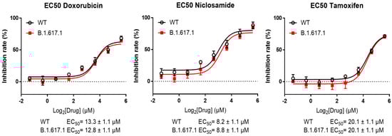 RBD attachment assay in wild-type and B.1.617.1 -variant SARS-CoV-2. EC50 profiles display the inhibitory effect of each compound on RBD attachment. The x-axis represents the compound concentration in log2 scale; the y-axis represents the inhibition rate.