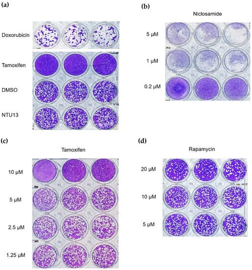 Plaque reduction assay for the candidate compounds. Infected cells were treated with individual compounds for 120 h to evaluate the antiviral activity. (a) Treatment with six compounds at a concentration of 10 μM. (b) Treatment with niclosamide at three concentrations. (c) Treatment with tamoxifen at four concentrations. (d) Treatment with rapamycin at three concentrations.