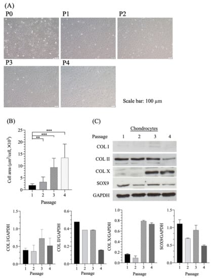 First, we examined primary (P0) versus passaged (P1–P4) articular chondrocytes obtained from rabbit articular joints. These chondrocytes cultured in the 2D flask served as the conventional model for examining the mechanisms of dedifferentiation or redifferentiation associated with the chondrocyte phenotype treated with chemicals in the present study. Figure 1A presents the morphology of freshly isolated (P0) and passaged P1–P4 chondrocytes. The P0–P1 chondrocytes were small, exhibited fibroblast-like sharp spindles and had no obvious morphological changes. When the chondrocytes were subcultured to the P2, P3 and P4 passages, they elongated into a fibroblast-like structure and reached confluency in a monolayer manner without aggregate formation. An increasing number of chondrocytes exhibited a polygonal shape with large and flattening characteristics after passage through three or four cultures. Moreover, the cell area increased significantly after passage through three or four cultures (Figure 1B). The Western blot analysis indicated that the proportion of chondrocytes producing COL II and SOX9 decreased with the increased passage of in vitro expanded 2D cultures. SOX9 is considered a master transcription factor for chondrocyte differentiation; it drives changes in the expression of ACAN, COL II and COL I []. The SOX9 protein could be readily identified through Western blot (Figure 1C). P3 chondrocytes displayed a pronounced enhancement of the SOX9 protein; however, the SOX9 protein substantially decreased with the increased passage of the chondrocyte culture. By contrast, hypertrophic chondrocytes with a large cell area (Figure 1B) exhibited significantly increased COL X production after passage through three cultures (Figure 1C). The result was consistent with other studies, which indicated that the chondrocytes underwent hypertrophy and deposited COL X in a long-term culture period [,]. Conversely, Western blot revealed that chondrocytes expressed less COL I protein, which might be because freshly purified chondrocytes maintain their phenotype until passage 4 and secrete less COL I, which could not be detected through Western blot.