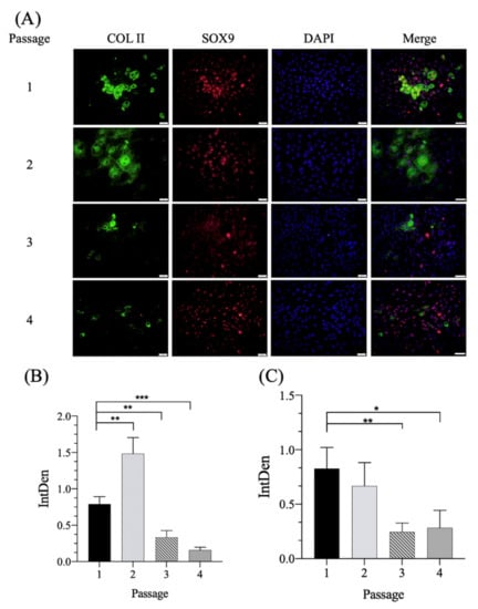 (A) Immunofluorescence staining of P1–4 chondrocytes. Semiquantitative assay through immunofluorescence staining determined using ImageJ software of (B) COL II and (C) SOX9. Green color: COL II staining, red color: SOX9 staining and blue color: DAPI staining. Scale bar: 50 µm. * p < 0.05, ** p < 0.01 and *** p < 0.001 (n = 4).