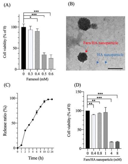 (A) Cell viability based on the 3-4,5-dimethylthiazol-2-yl-2,5-diphenyltetrazolium bromide (MTT) assay of farnesol. (B) Transmission electron microscopy image of the hyaluronan-encapsulated farnesol (Farn/HA) nanoparticle. The encapsulation of farnesol was approximately 90% (0.8-mM farnesol was added to produce the hyaluronan (HA) nanoparticle). The Farn/HA nanoparticle was 58 ± 10.4 nm in diameter. Scale bar: 100 nm. (C) The release profile of farnesol. Approximately 90% of farnesol was released after a 10-h culture. (D) Cell viability based on the MTT assay of the Farn/HA nanoparticle. * p < 0.05, ** p < 0.01 and *** p < 0.001 (n = 3).
