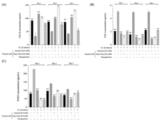 Enzyme-linked immunoassay (ELISA) kit assays of production of (A) COL II and (B) COL I proteins. (C) PGE2 synthesis of IL-1β-induced dedifferentiated chondrocytes treated with farnesol and the Farn/HA nanoparticle after 1-, 3- and 5-d culturing as compared with IL-1β-induced dedifferentiated chondrocytes. * p < 0.05, ** p < 0.01 and *** p < 0.001 (n = 3). +: treated, −: untreated.
