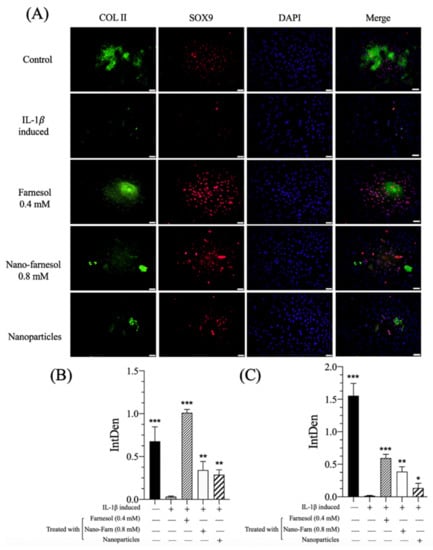 (A) Immunofluorescence staining and a semiquantitative assay of (B) COL II and (C) SOX9 of IL-1β-induced dedifferentiated chondrocytes treated with Farn 0.4 mM, Nano-Farn 0.8 mM and HA nanoparticles (after 5-d culturing). Green: COL II staining, red: SOX9 staining and blue: DAPI staining as compared with IL-1β-induced dedifferentiated chondrocytes. * p < 0.05, ** p < 0.01 and *** p < 0.001 (n = 3). Scale bar: 50 µm. +: treated, −: untreated.