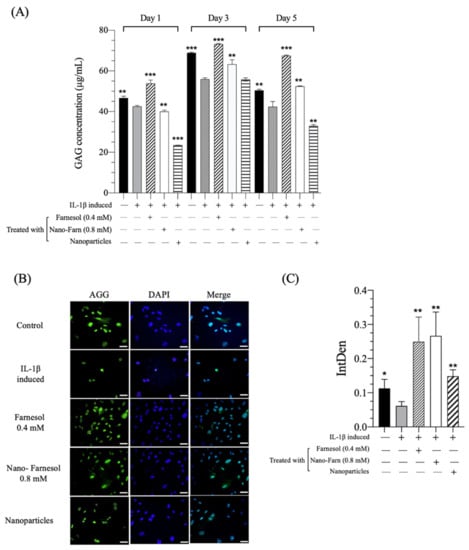 (A) GAG synthesis of IL-1β-induced dedifferentiated P2 chondrocytes after 1-, 3- and 5-d culturing determined through the Blyscan Glycosaminoglycan Assay kit. (B) Immunofluorescence staining and (C) Semiquantitative assay of AGG of IL-1β-induced dedifferentiated chondrocytes treated with Farn 0.4 mM, Nano-Farn 0.8 mM and HA nanoparticles (after 5-d culturing). Green: GAG staining and blue: DAPI staining as compared with IL-1β-induced dedifferentiated chondrocytes. * p < 0.05, ** p < 0.01 and *** p < 0.001 (n = 3). Scale bar: 50 µm. +: treated, −: untreated.