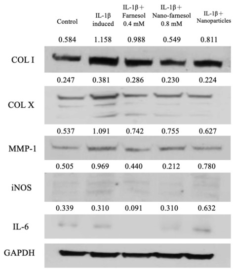 We explored the effect of farnesol treatment on IL-1β-stimulated chondrocytes through the quantification of dedifferentiation according to the COL I, COL X, MMP-1, iNOS and IL-6 inflammatory protein levels through Western blotting (Figure 7). We observed that these protein levels increased in IL-1β-stimulated chondrocytes as compared with the controls. These dedifferentiation and inflammation proteins decreased to a level lower than that in the control group after treatment with farnesol. These results are comparable with previous findings []. In IL-1β-stimulated chondrocytes, iNOS-catalyzed NO production led to increased MMP-1 expression, and similarly, IL-6 triggered the synovial membrane to produce MMP-1 and -13, degrading the cartilage structure and COL II. Reports have indicated that IL-6 plays a crucial role in cartilage degeneration through MMP induction in the joint [,]. Taken together, the stimulation of chondrocytes with IL-1β led to inflammation in chondrocytes, leading to inflammatory cytokine production and the secretion of dedifferentiated COL I and COL X proteins. All changes caused by IL-1β stimulation on chondrocytes accelerated cartilage degeneration and OA progression.