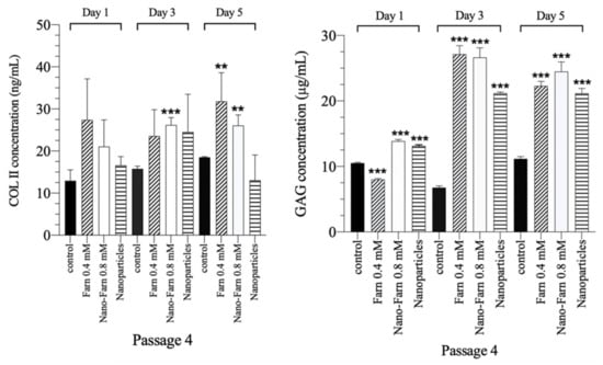 Increase in COL II and GAG in P4 chondrocytes treated with farnesol, Farn/HA and nanoparticles as compared with the control group (from Figure 6). ** p < 0.01 and *** p < 0.001 (n = 3).
