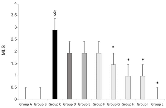 Gastric modified Lanza score (MLS) gastroscopy evaluation in healthy volunteers receiving placebo orally or sublingually (Groups A and B, respectively); receiving 100 or 50 mg of standard aspirin orally (Groups C and D, respectively); receiving 100 or 50 mg of standard aspirin sublingually (Groups E and F, respectively); receiving aspirin micronized and cogrinded with collagen orally (Groups G and H) or sublingually (Groups I and L). § p < 0.05 standard aspirin vs. placebo; * p < 0.05 collagen cogrinded aspirin vs. standard aspirin.