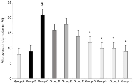 Gastric sub-epithelial micro-vessel diameter in healthy volunteers receiving placebo orally or sublingually (Groups A and B, respectively); receiving 100 or 50 mg of standard aspirin orally (Groups C and D, respectively); receiving 100 or 50 mg of standard aspirin sublingually (Groups E and F, respectively); receiving aspirin micronized and cogrinded with collagen orally (Groups G and H) or sublingually (Groups I and L). § p < 0.05 standard aspirin vs. placebo; * p < 0.05 collagen cogrinded aspirin vs. standard aspirin.