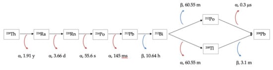 Another approach was based on collection via electrodeposition and adsorption of derivatives. In [11], positive and negative plates were placed in a one-liter bottle; on the lower, positive aluminum plate, 228Th hydroxide was placed. 228Th hydroxide was obtained via precipitation from thorium nitrate solution. The potential between the positive plate and negative platinum coil caused positively charged 212Pb-ions to move to the negative plate, dissolving with, e.g., 3 M nitric acid. The total yield of the facility was 20%, so other methods of efficient 212Pb production were required. Moreover, the issue of 224Ra presence on the coil’s surface was not clarified. A remarkable approach was introduced in [12]. Namely, chemically purified, carrier-free 232U was electrostatically deposited on a steel plate and stored for 4 years to accumulate daughter nuclides. After placing this source at a distance of 0.2 mm from a separate material, the latter began to accumulate recoil nuclei of 232U daughters for further applications. After irradiation of the recipient material in a vacuum chamber, the alpha-spectrometric analysis showed that 232U-peaks were not observed on the target surfaces and proved that all activities were transferred by the recoil effect. Thus, this approach could not be used for pure 212Pb production.