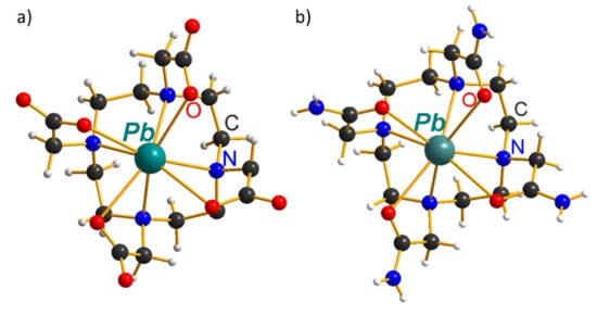 Alternatively, completely unsubstituted cyclen (CN4) [49] and its pyridine analog (CN4) L3 [52] coordinate Pb2+ so as to leave the space for LP, the addition of one coordinating pendant arm in L1 [52] still allows one-side coordination with shortened Pb–N bonds on the side opposite to LP. Further introduction of four groups, TCMC, DOTA, THP-cyclen, causes a significant decrease in differences between values of bonds’ lengths Pb–N and Pb–O (Table 1). Moreover, from Pb–cyclen to Pb–THP–12aneN4 and from Pb–L3 to Pb–L2 [52], a small but regular decrease in logβ (PbL) occurs (Table 2). Such an effect is caused by the transition from hemidirected to holodirected LP [49,55] being thermodynamically disadvantageous. Similarly, in complex with EDTA LP is hemidirected, but upon ligand’s modification to EEDTA and EGTA LP of Pb2+ becomes inactive, leading to a large drop of logβ, while analogous modification does not cause such drastic break for Sr-EDTA and Sr-EGTA (Sr2+ and Pb2+ are similar regarding ionic radii [46]). Furthermore, basic nitrogen atoms bring covalent impact to the interaction with Pb2+ enhancing LP’s activity. This induces logβ drop upon substitution of NH-groups in cyclen by O-atoms [49]. However, accompaniment of N-donors by O-containing pendant groups increases the stability of formed complexes Pb–cyclen–Pb–DOTA or Pb–TCMC, Pb–en–Pb–EDTA.