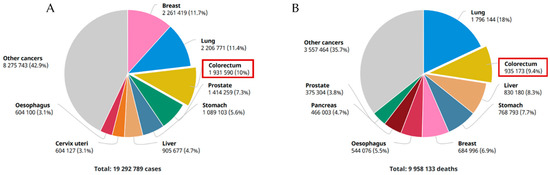 Incidence (A) and mortality rate (B) of CRC in 2020. Just under 2,000,000 people were diagnosed with CRC and around half of the cases resulted in death. Adapted from [9], with permission of the copyright holder.