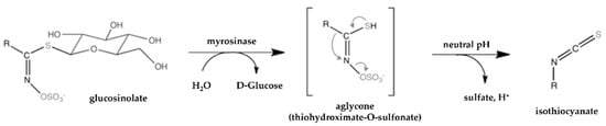 Mechanism of hydrolysis of a glucosinolate by myrosinase, originating isothiocyanates in neutral pH [71].