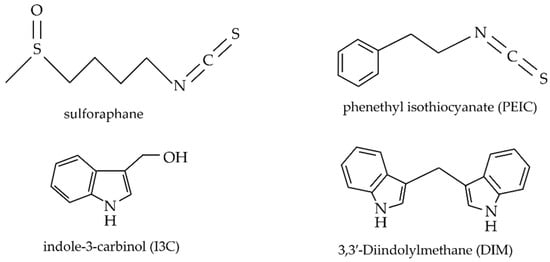 Chemical structures of the breakdown products sulforaphane, PEITC, I3C and DIM [75].