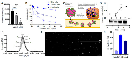 Release of CXCR4-targeted cytotoxic nanoconjugates from protein–drug depots. (A). Internalization of T22-GFP-H6-ATTO488 MPs into HeLa cells in absence or in presence of the CXCR4 antagonist AMD3100 (AMD) or soluble T22-GFP-H6 (T22). AU are arbitrary fluorescence units. (B). Dose-dependent viability of three different CXCR4+ cell lines upon exposed to T22-GFP-H6-MMAE MPs for 48 h (HeLa and Panc-1) and for 72 h (SW1417). (C). A model for the expected release of nanoconjugates from MP depots and remote targeting to and destruction of CXCR4-overexpressing cancer cells. MPs (around 2–3 microns) formed by T22-GFP-H6-MMAE (green and purple) would release T22-GFP-H6-MMAE NPs (around 11 nm) to the blood stream, in a way similar to that observed in T22-GFP-H6 IBs [65]. Since T22-GFP-H6 tends to assemble with the assistance of divalent cations from the media, T22-GFP-H6-MMAE are expected to occur as NPs. Because of the peptide T22 (red symbols), a ligand of CXCR4 (purple hexagonal symbols), these materials might accumulate intracellularly in CXCR4-overexpressing cells, as observed for unconjugated T22-GFP-H6 NPs [31]. This fact would allow a remote but selective destruction of the CXCR4+ tumor tissue. Symbols are as in Figure 1A,B). (D). Determination of protein conjugates released in vitro in a physiological buffer from T22-GFP-H6-MMAE MPs, through Western blot (inset) and densitometry. (E). MALDI-TOF analysis of released conjugates collected after 24 h of incubation in vitro. Numbers above the molecular masses indicate the corresponding number of MMAE molecules per polypeptide. (F). Ultrastructural characterization of the released nanoconjugates (T22-GFP-H6-MMAE NPs) collected after 24 h of MPs incubation in vitro. Size bars represent 100 nm. (G). Viability of three different CXCR4+ cell lines upon exposure to T22-GFP-H6-MMAE NPs for 48 h (HeLa and Panc-1) and for 72 h (SW1417). The tested material was collected after 24 h of MP incubation in vitro. * p ≤ 0.05.