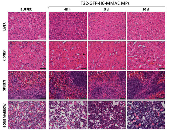 Toxicity analysis of T22-GFP-H6-MMAE MPs in a SC CXCR4+ DLBCL mouse model. H&E staining of the liver, kidney, spleen and bone marrow of mice treated with buffer or MPs at 48 h, 5 and 10 days after the treatment. Pictures were taken at 400× (scale bars = 50 μm).