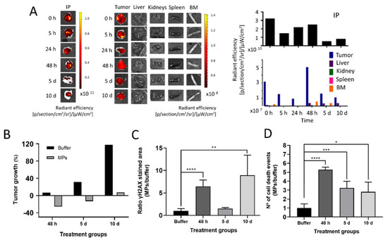 In vivo biodistribution and antitumoral effect of subcutaneously administered protein-MMAE depots in a SC mouse model of CXCR4+ DLBCL− cells. (A). Ex vivo fluorescence imaging (left) and numerical representation of FLI (right) at the injection point (IP) and tumor, liver, kidneys, spleen and bone marrow (BM) upon remote subcutaneous administration of 1 mg of T22-GFP-H6-MMAE MPs in SC CXCR4+ DLBCL mouse model. Different recording times are shown from 5 h to 10 days. Fluorescence intensity (FLI) was calculated subtracting the autofluorescence of buffer-treated mice and represented as radiant efficiency. (B). Tumor volume variation relative to time 0 at 48 h, 5- and 10 days post administration of T22-GFP-H6-MMAE MPs. (C). Quantification of the IHC-positive stained tumor tissue area marked by γH2AX at 48 h, 5 and 10 days after the administration of T22-GFP-H6-MMAE MPs. The ratio quantification was obtained by dividing the area of positive cells in 5 counted fields in MP-treated samples by the mean of the positive area in 5 fields of buffer-treated samples. (D). Quantification of cell death events by DAPI staining in tumor tissues at different times post administration of T22-GFP-H6-MMAE MPs. The ratio quantification was obtained by dividing the number of cells undergoing MC or apoptosis in 5 fields of MPs-treated samples (48 h, 5 and 10 days) by 5 fields of buffer-treated samples. * p ≤ 0.05; ** p ≤ 0.01; *** p ≤ 0.001; **** p ≤ 0.0001.